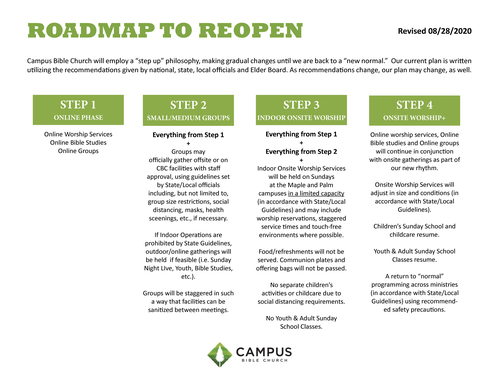 Printed Materials: We will limit the distribution of printed materials. Connection Cards, Sermon Notes, and Bulletins will be available online or on the church app.
